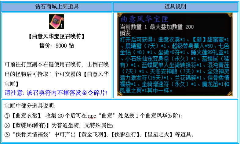1、【曲意风华宝匣召唤符】仅限钻石商城购买,通过摆摊购买、互相交易、邮件领取、拍卖购买等非钻石商城购买方式获得的,不计算在活动区服内;