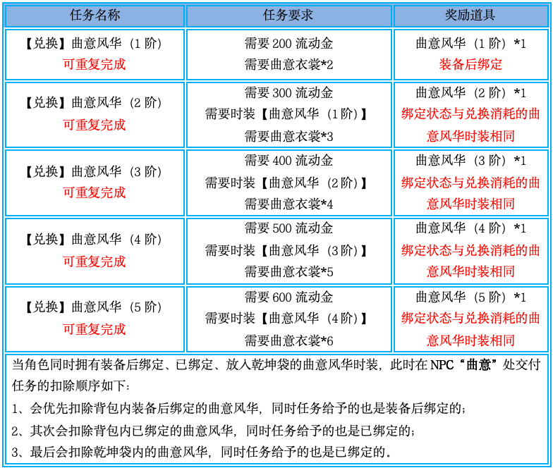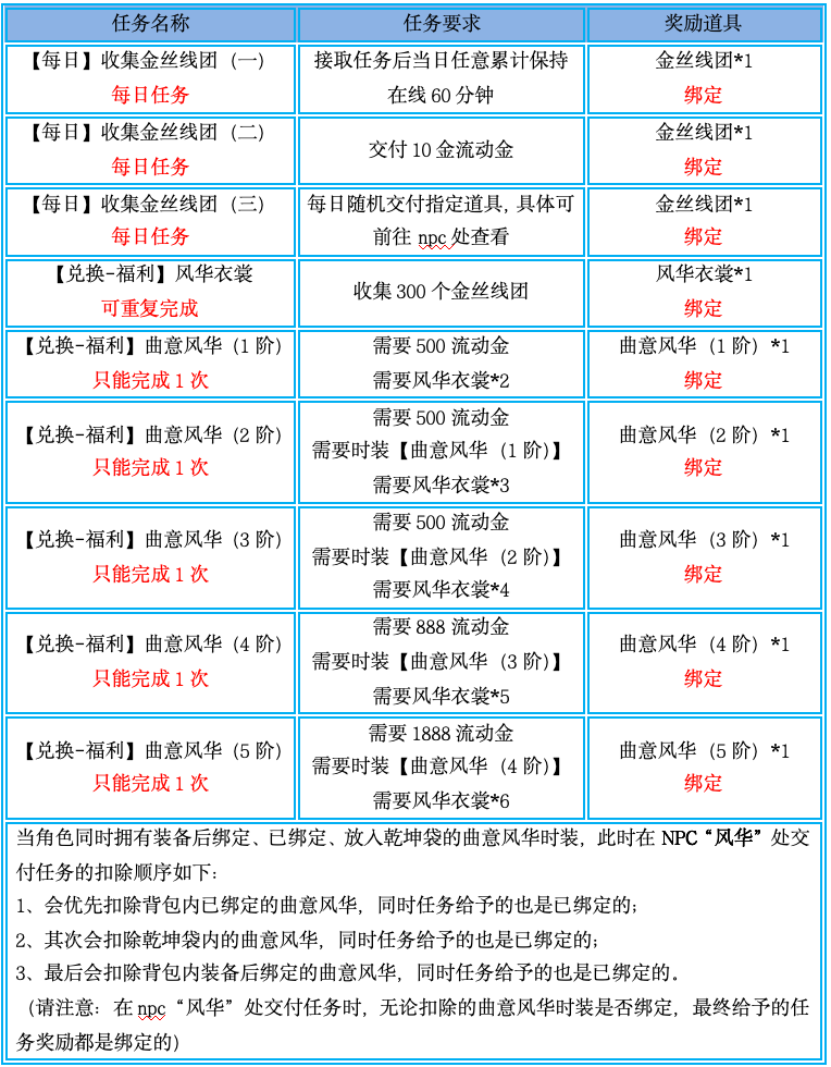 1、在npc“曲意”、“风华”处虽然都能接取时装任务,但是两个npc的任务需要交付的时装在扣除时的先后顺序并不相同,请至npc处仔细查看确认后再进行交付,以免造成损失;