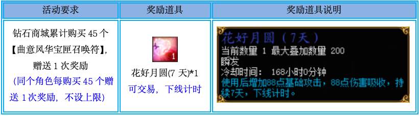 2、活动期间,同个角色在钻石商城每累计购买满45个【曲意风华宝匣召唤符】,可获得1个“花好月圆(7天)”,不设上限。例如:玩家A在钻石商城购买了90个【曲意风华宝匣召唤符】,则可以获得2个“花好月圆(7天)”的奖励;