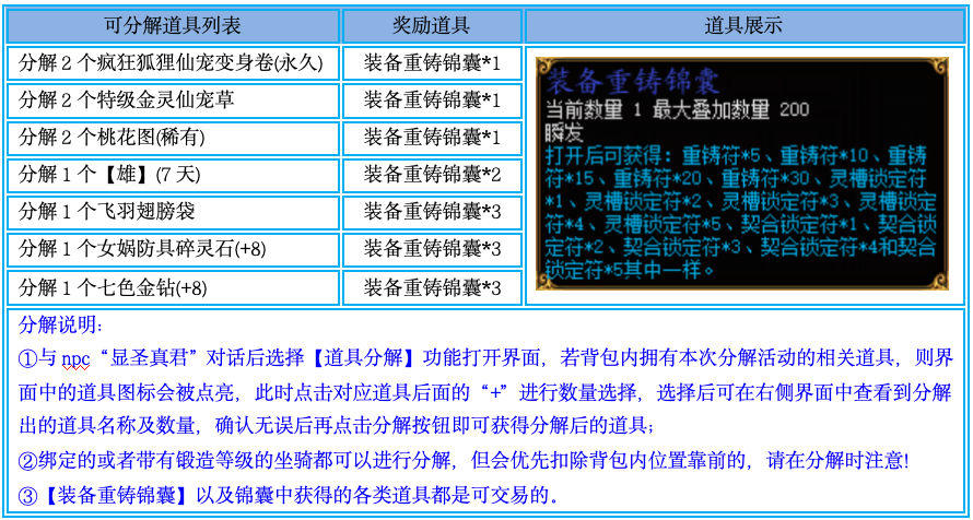活动期间,可在成都npc“显圣真君”处(成都:273,-507)分解以下道具: