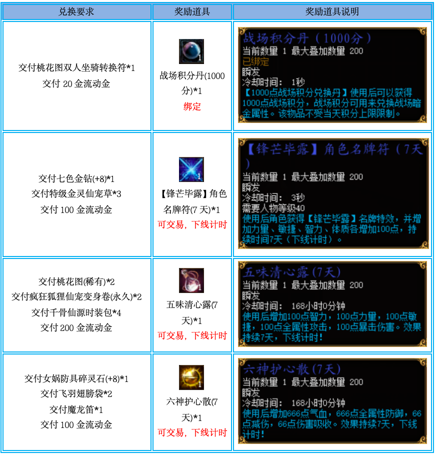 活动期间,NPC“藏宝阁阁主”处将上架以下道具可供兑换: