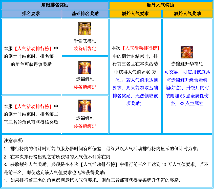 2、本活动开启前,角色已经获得的人气值不会计算在内,必须要在活动开启后获得的人气值才为有效;
